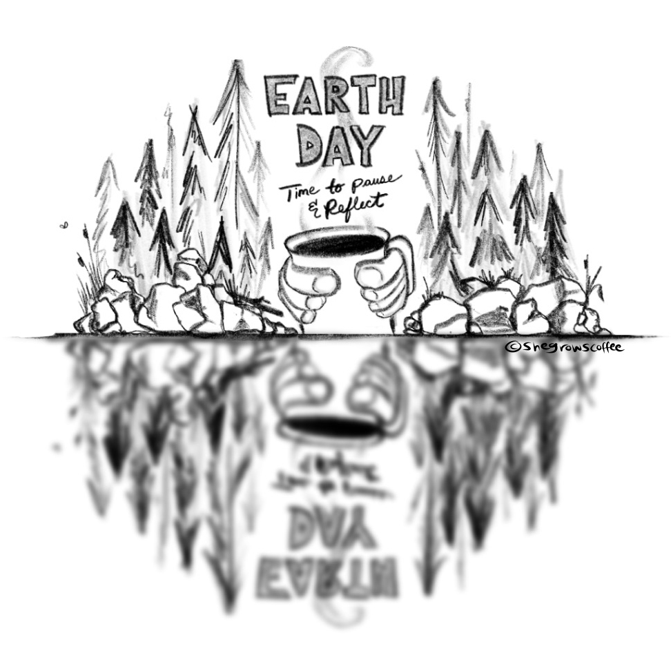This ‘Earth Day’ concept art was inspired by the idea of a Northern (hence the conifer forest) coffee consumer pausing to reflect on how we impact the Earth in our daily lives. It was created in conjunction with an Earth Day blog post that includes my personal ‘Lifestyle List’ for a Cooler Planet.