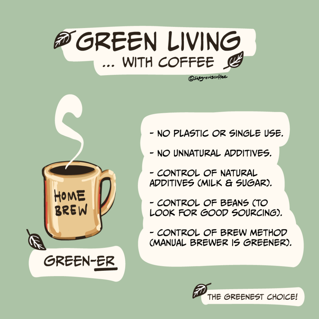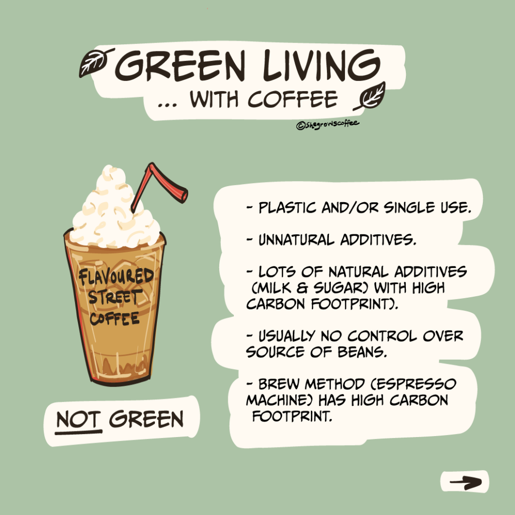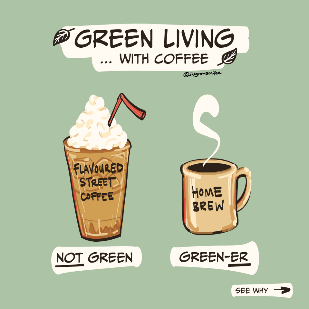 “Green Living” is about making daily lifestyle choices with the planet in mind … And while our coffee (drug) habit is not green (for many reasons), most of us drink coffee every day and have the power to adjust our habit to be greener. Brewing our own coffee at home, instead of making flavoured street coffees our source of daily caffeine, is one of the simplest things we can do to live green-er with coffee.